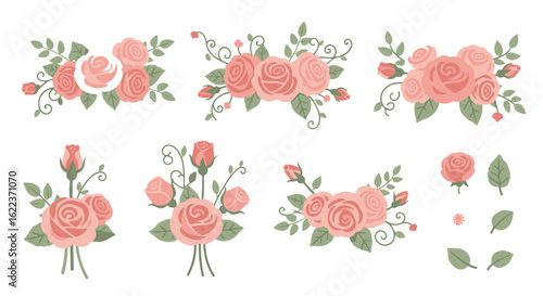 A collection of charming, pastel pink rose bouquets and floral elements, perfect for design projects.