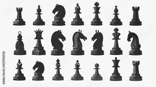 A collection of chess pieces placed on a plain white surface