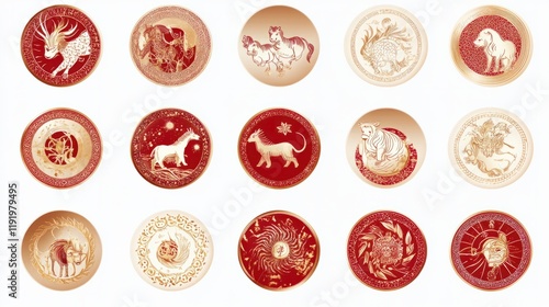 A collection of Chinese zodiac icons, featuring animals surrounded by symbolic patterns, presented in red and gold, isolated on white