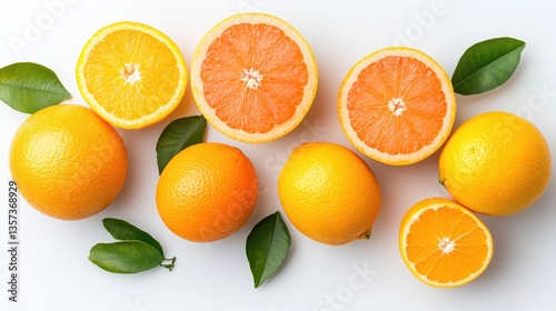 A collection of citrus fruits including lemons or oranges and limes with fresh green leaves on a clean white background for healthy eating