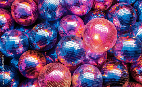 A collection of colorful disco balls reflecting light.
