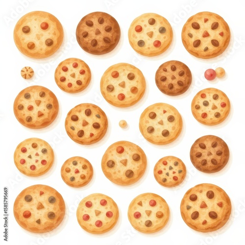 a collection of cookies, arranged in a 3x3 grid on a white background, watercolor style