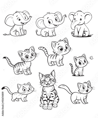 A collection of cute cartoon animals, including elephants and cats, in black and white, line art style.