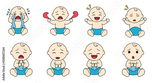 A collection of cute cartoon babies expressing a wide range of emotions through facial expressions and body language