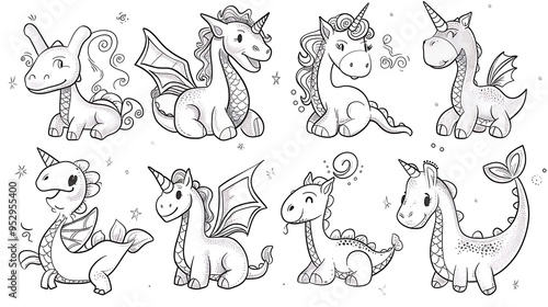 A collection of cute, cartoon-style mythical creatures, including unicorns and dragons, designed for coloring.