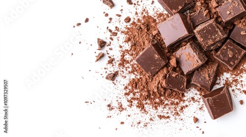 A collection of dark chocolate pieces and cocoa powder on a white background.
