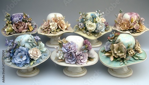 A collection of decorative hats adorned with flowers is arranged neatly on a table, showcasing their vibrant colors and intricate designs.