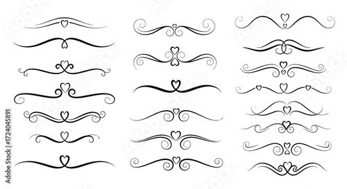 A collection of decorative ornamental flourishes with elegant heart shapes and swirling designs for embellishment.