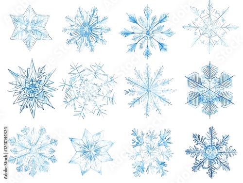 A collection of delicate icy blue snowflakes in various intricate symmetrical designs isolated on a white background, perfect for winter-themed graphics and prints.