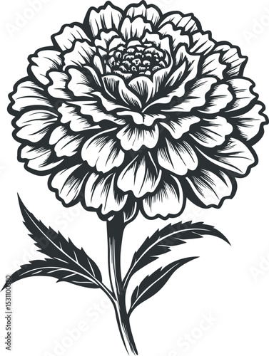 A collection of detailed black and white line art illustrations of marigold flowers, showcasing their intricate petals and foliage