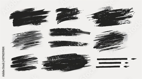 A collection of different black brush strokes and artistic tools, such as pencils and brushes, are displayed on a white canvas. The strokes vary in texture and width.