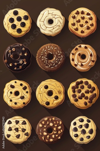 A collection of donuts with various toppings, including chocolate chips, sprinkles, and nuts