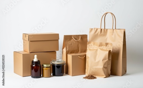 A collection of eco-friendly packaging materials, including paper bags, glass jars, and a plant, on a white background.