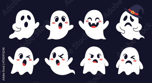 A collection of eight cute ghosts with various expressions, some wearing a witch hat, set against a dark background, perfect for Halloween.