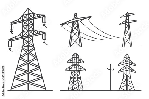 A collection of electricity pylons and power transmission towers are drawn in a simple line art style isolated on white background