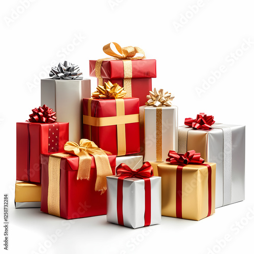 A collection of elegant gift boxes in varying sizes, wrapped in shiny gold, red, and silver paper, with satin ribbons tied neatly on top, placed on a white background