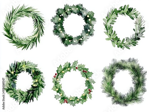 A collection of elegant wreaths showcasing various greens and floral accents, perfect for seasonal decoration. white background