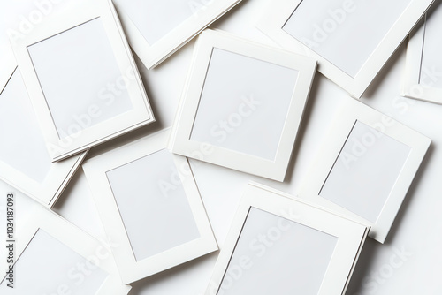 A collection of empty white photo frames stacked on a light surface, ready for your favorite memories.