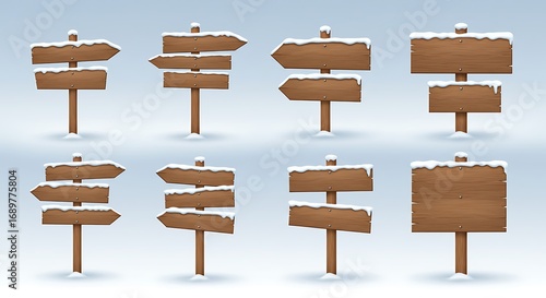 A collection of empty wooden directional arrow signs and blank signboards covered with snow, illustrating choices and winter guidance