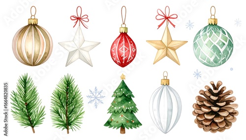 A collection of festive Christmas decorations, including ornaments, stars, pine branches, a Christmas tree, and a pine cone, rendered in watercolor style.