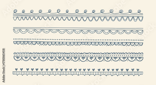 A collection of five decorative hand-drawn borders with intricate patterns and delicate designs.