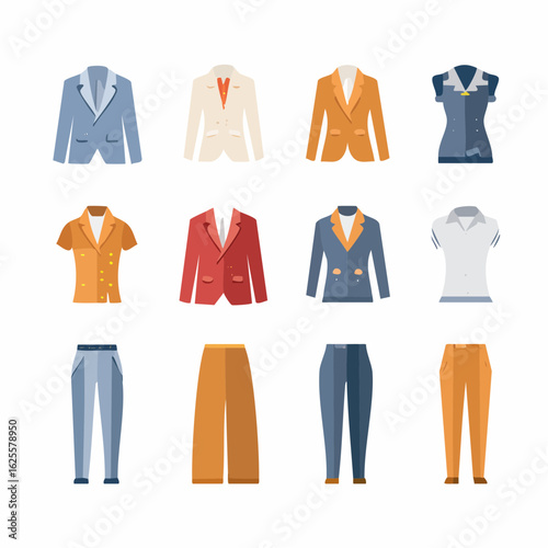 A collection of flat design icons depicting business and office attire. Simple silhouettes of suits, blazers, trousers, and shirts for men and women.