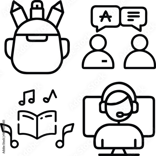 A collection of four simple line art icons illustrating education, communication, music, and online learning or support.
