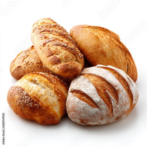 A collection of fresh, golden, baked loaves of bread, offering a comforting and appetizing sight. The image emphasizes the variety of textures and shapes.