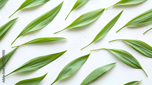 A collection of green leaves arranged artistically on a white background, showcasing vibrant colors and natural textures.