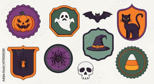 A collection of Halloween-themed badges and stickers featuring pumpkins, ghosts, bats, black cats, spiders, witch hats, skulls, and candy corn.