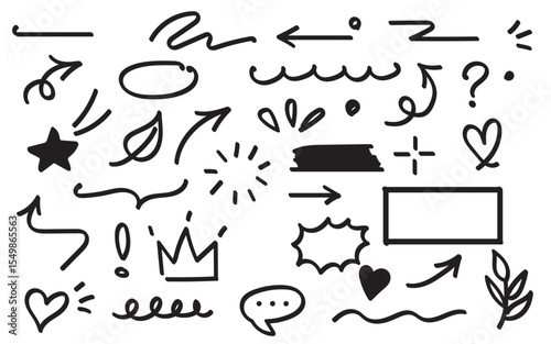 A collection of hand drawn doodle elements including arrows hearts stars and other graphic symbols