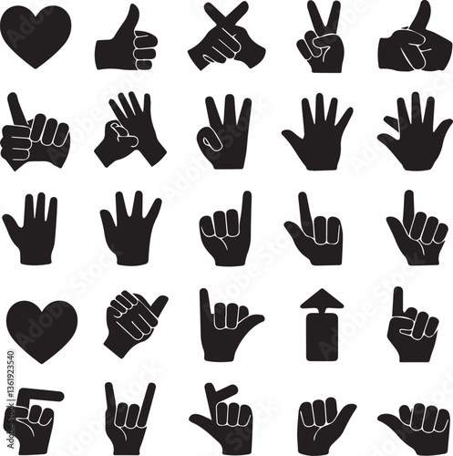 A collection of hand gestures and icons featuring different hand positions, fingers, and palms, including human symbols like thumbs up, OK sign, and numbered gestures in a vector art style