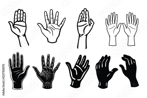 A collection of hand gestures illustrated in black and white silhouettes, showcasing diverse positions and movements