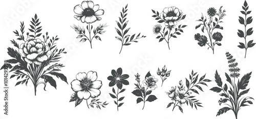 A collection of hand-drawn botanical illustrations featuring various plants, including a hibiscus flower, sprigs, and delicate blooms, black and white style.