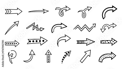 A collection of hand-drawn doodle arrows in various styles and directions, isolated on a white background.