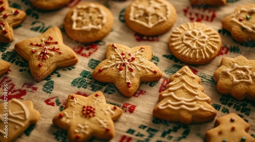 A collection of holiday cookies in festive shapes, displayed on a cheerful tablecloth.