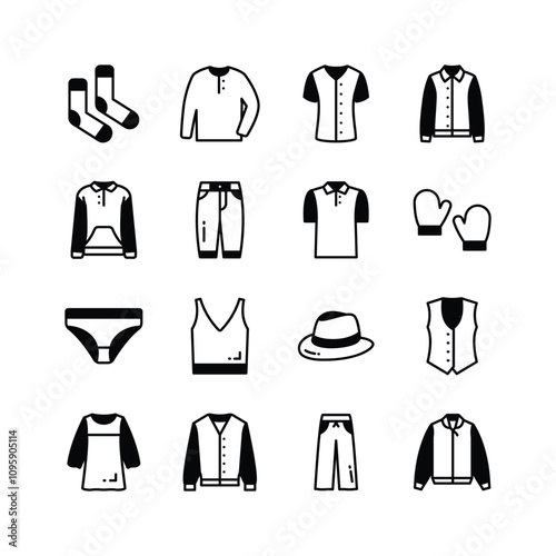 A collection of icons representing various clothing items, including shirts, pants, socks, gloves, hat, and underwear.