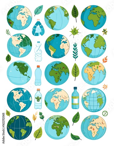 A collection of illustrated globes, plastic bottles, and leaves, promoting environmental awareness