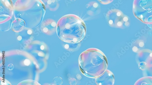 A collection of iridescent soap bubbles against a soft blue sky, creating a whimsical and ethereal background.