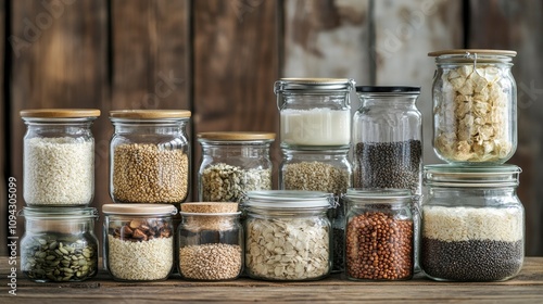 A collection of jars filled with various grains and seeds on a wooden surface.