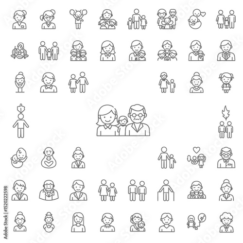 a collection of line art, icons depicting diverse family, and social relationships, black, white