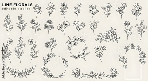 A collection of line floral illustrations featuring various flower designs and arrangements on a light background.