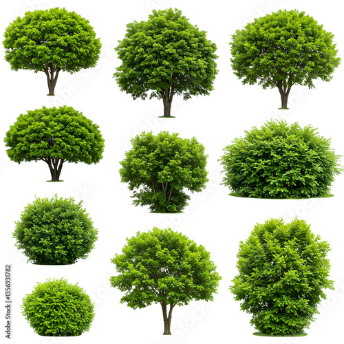 A collection of lush green trees and bushes in various shapes and sizes, showcasing different tree types and foliage structures. Ideal for nature, landscaping, or environmental-themed projects.