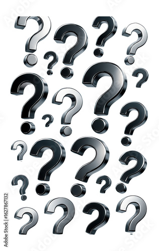 A collection of metallic question marks in various sizes floats against a white background, symbolizing inquiry, uncertainty, and curiosity.