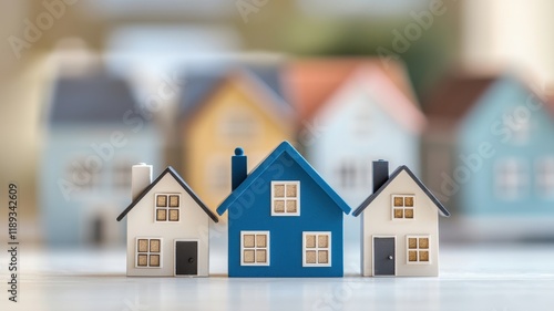 A collection of miniature houses, featuring a prominent blue house, set against a blurred background of colorful homes.