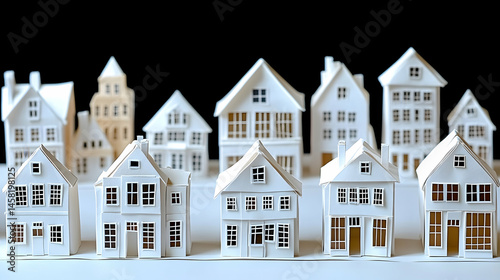 A collection of miniature white and beige houses, varying in height and design, arranged in a row against a black background