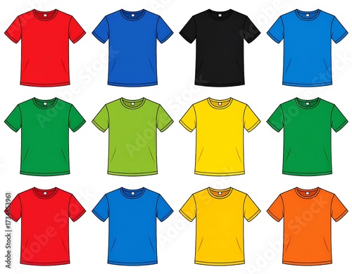 A collection of multicolored blank t-shirts displayed on a white backdrop