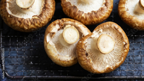 a collection of mushrooms with long stems and brown caps on a dark slate surface.