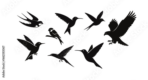 A collection of nine bird silhouettes in various poses, including flying, perching, and hovering.
