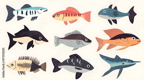 A Collection of Nine Colorful and Stylized Fish Illustrations